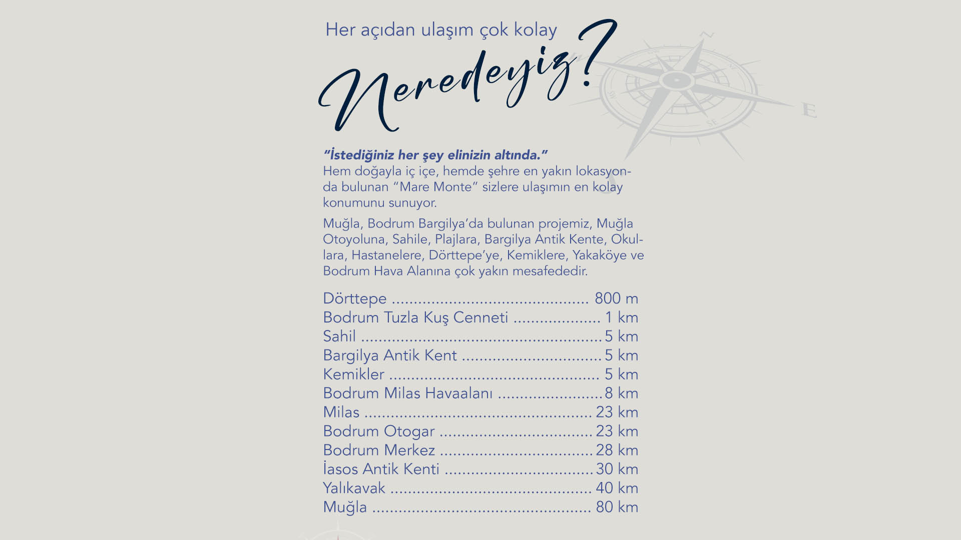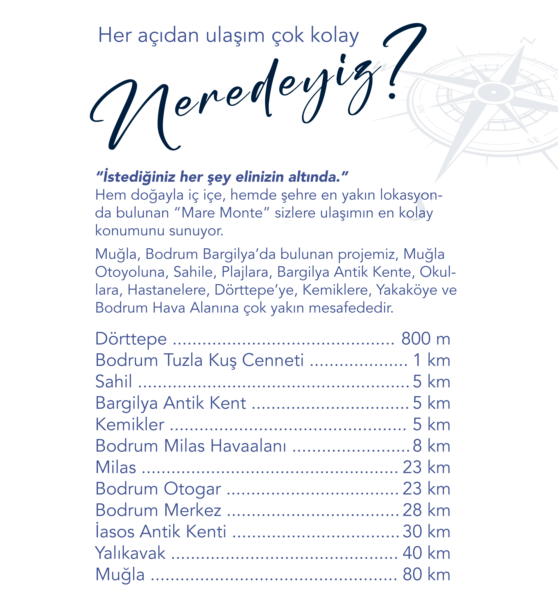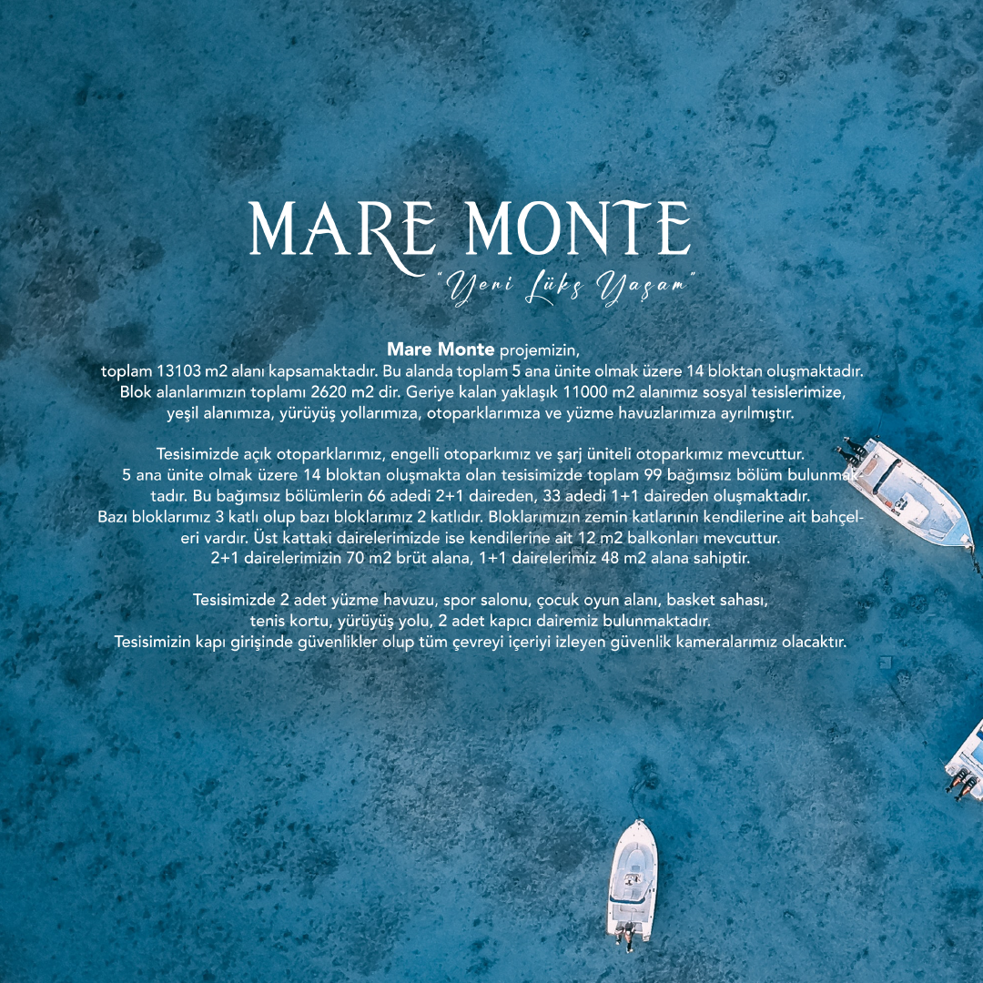 Mare Monte projemiz, Muğla ili Milas ilçesi Dörttepe Mahallesi, Sığırtmaç mevkinde konumlanmaktadır. Projemizin toplam 13103 m2 alanı kapsamaktadır.